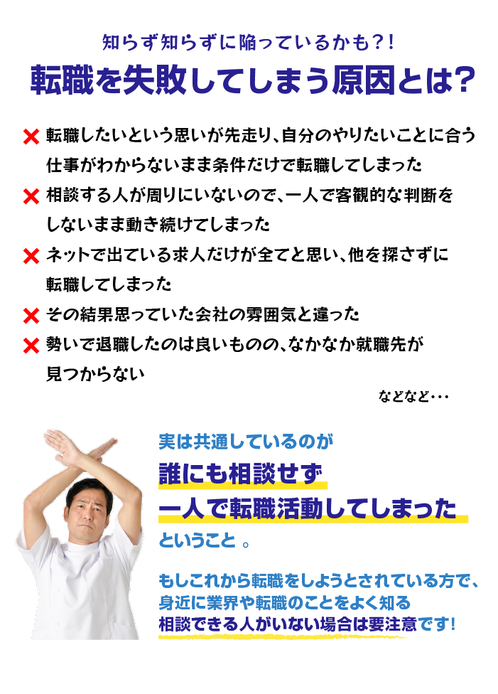 在籍エージェントは整骨院業界を専門に転職支援を 行ってきた精鋭揃い。整骨院業界の転職事情を熟知 しているので、多くの求人の中から、アナタに最適な 求人がご提案できます。 その他にも業界に特化しているので 「非公開求人や独占求人に応募できる」 「企業の内部情報を入手できる」 「書類審査や面接の通過率が高くなる」 などの転職活動を有利に進められるメリットも。