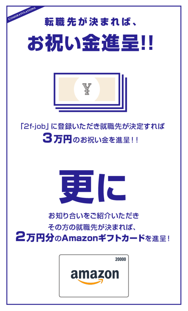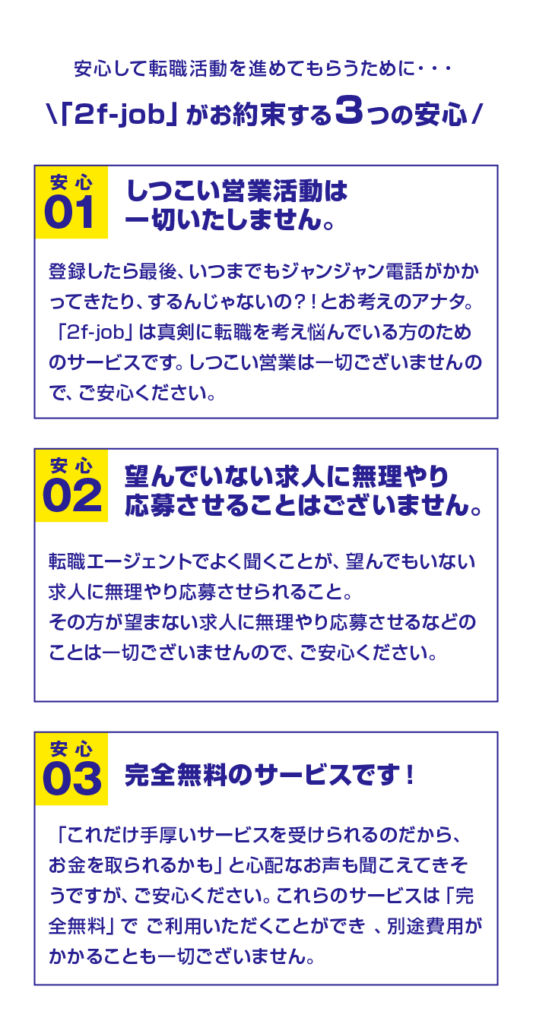 なんとこれらの徹底したマンツーマン転職サポートに 費用は一切かかりません。「2f-job 」は求人を募集 する企業様から頂く、紹介手数料により事業が成り 立っています。そのため、ご利用頂く転職者様からは 一切料金を頂いておりませんので、安心してご利用 ください。